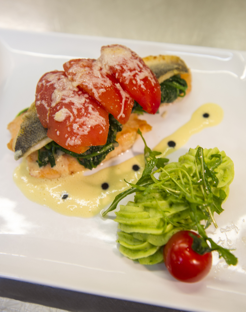 Lachsfilet mit jungem Blattspinat und geschmolzenen Tomaten